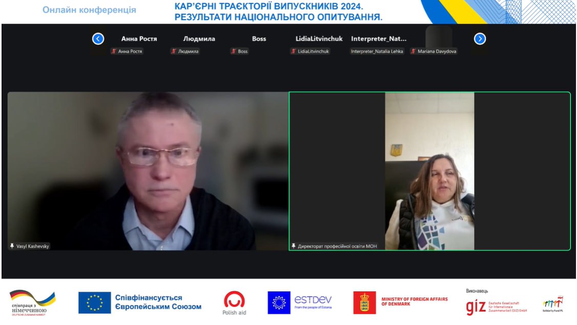 Мета: презентація загальних результатів опитування кар’єрних траєкторій випускників 2024 року та дашборду (інформаційної панелі) з даними опитування, обговорення можливостей використання отриманих результатів закладами професійної освіти, зокрема, кар’єрними радниками.