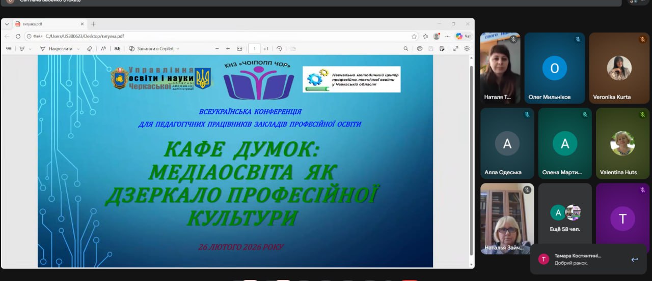 Педагогічні працівники Професійно-технічного училища № 26 м. Кременчука 26 лютого 2026 року долучилися до Всеукраїнської онлайн-конференції «Кафе думок: медіаосвіта як дзеркало культури».