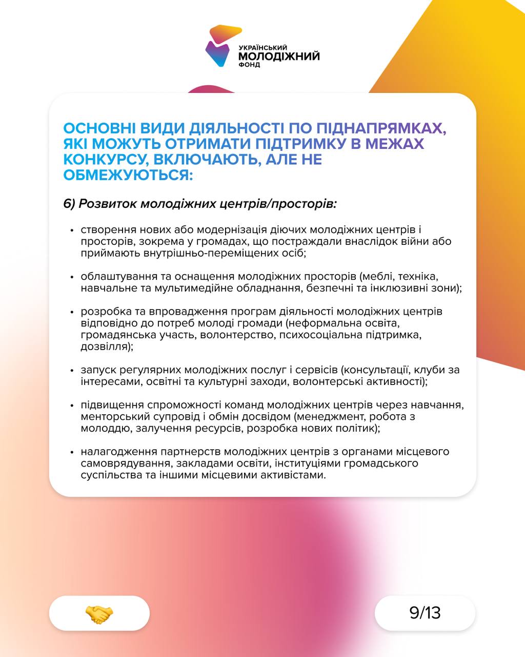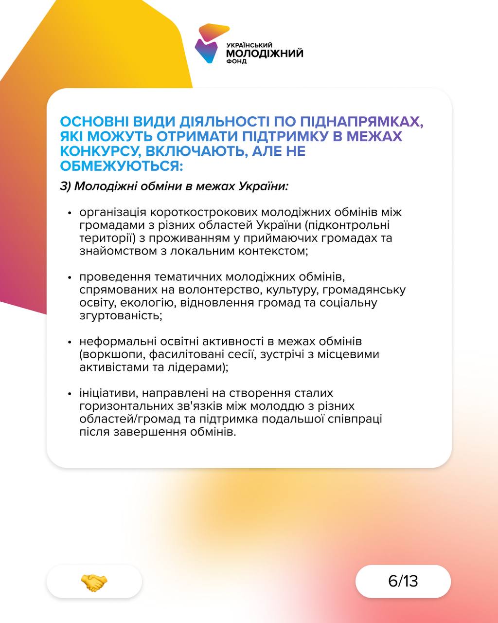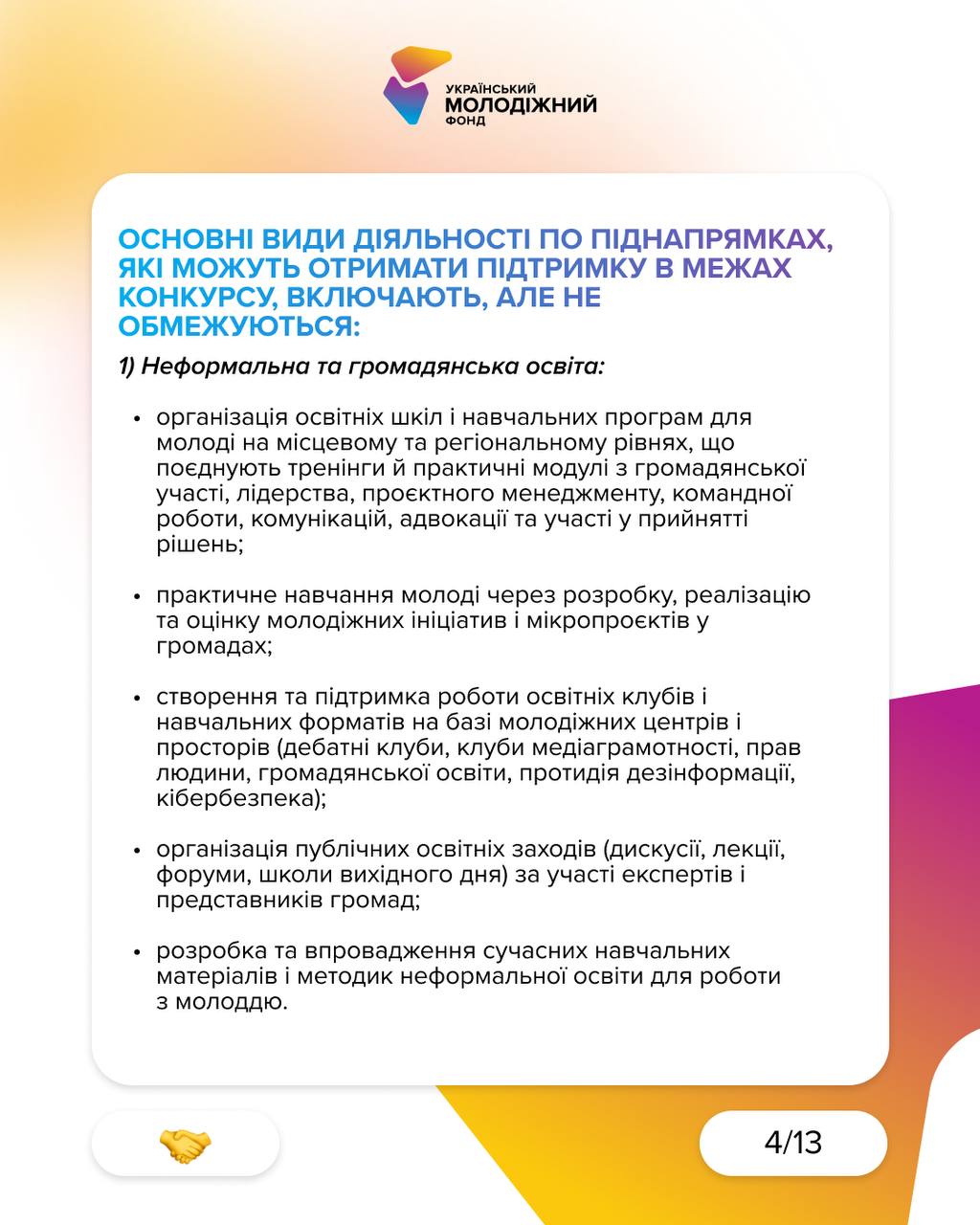 Проєкти, що посилюють участь молоді та згуртовують громади. Серед видів діяльності: