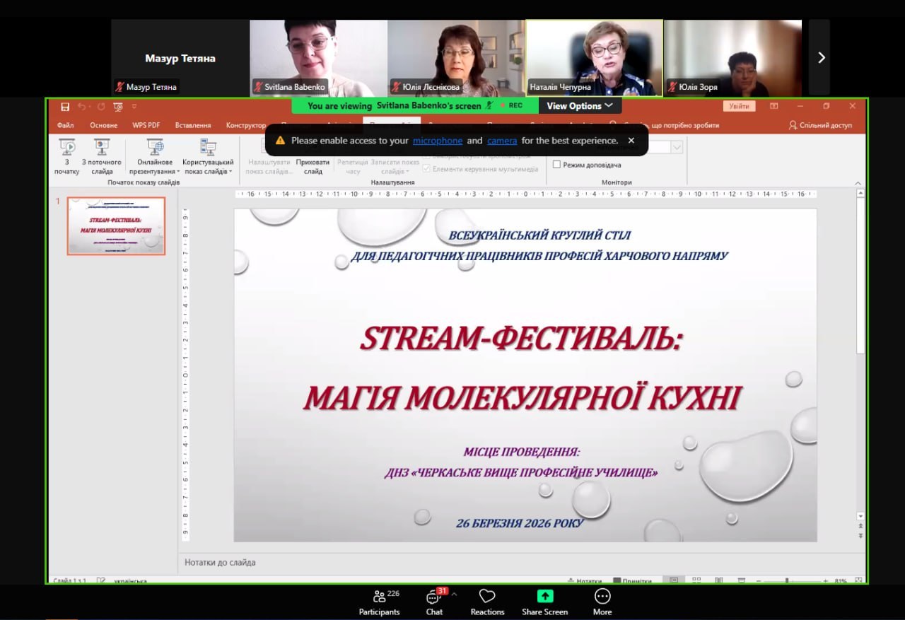 Педагогічні працівники професій харчового напрямку Професійно-технічного училища № 26 м. Кременчука 26 березня 2026 року долучилися до Всеукраїнського круглого столу на тему: «STREAM- фестиваль: магія молекулярної кухні».